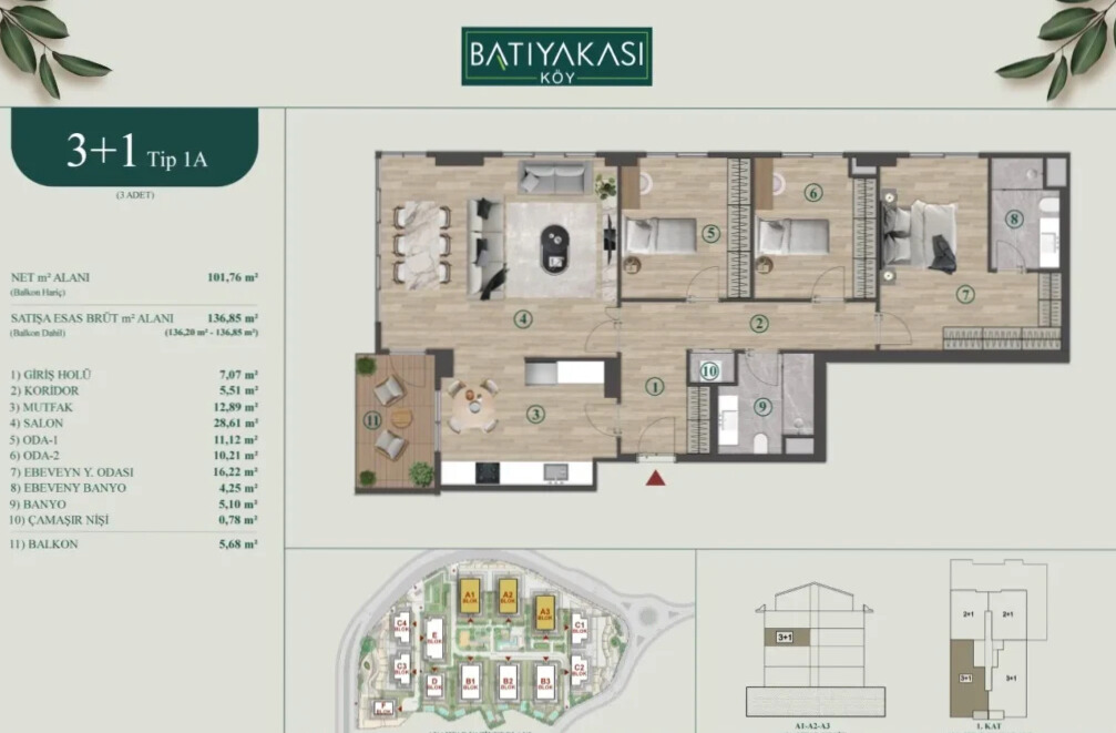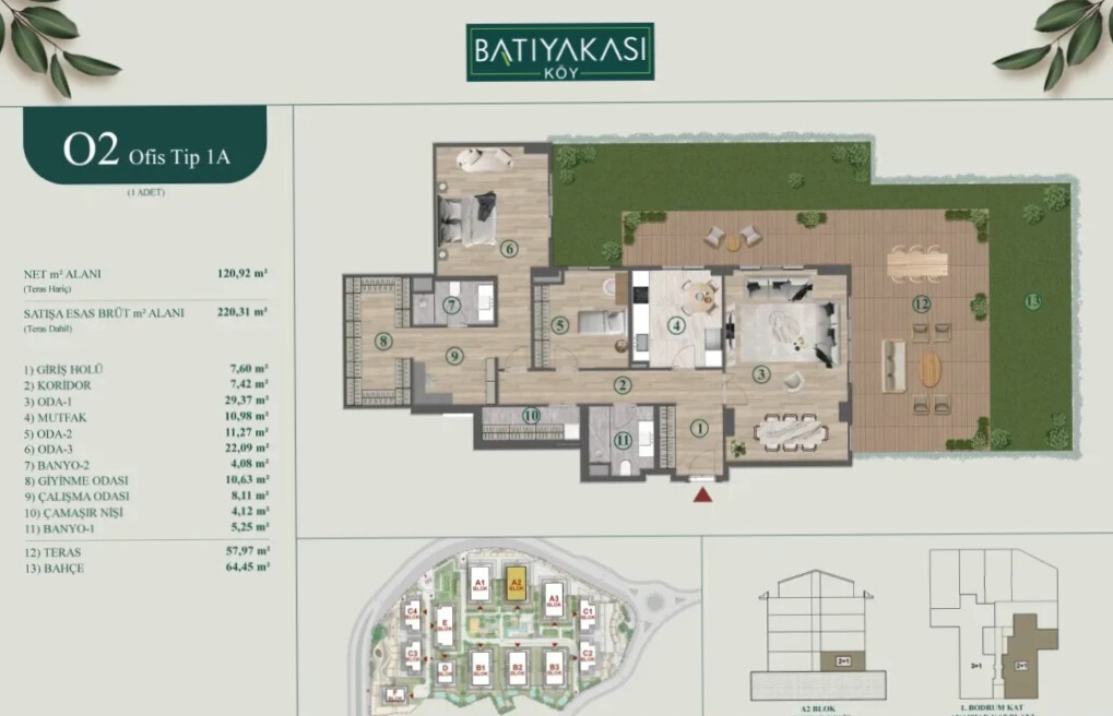 Batıyakası Köy’ün zarif mimarisinin seçkin örneklerinden biri olan Ofis Tip 1A, geniş terası, özel bahçesi ve ferah yaşam alanlarıyla farklı beklentilere hitap eden bir yaşam deneyimi sunuyor. Bu özel kat planı, hem yaşama hem de çalışma alanlarını bir araya getirmek isteyenler için ideal bir çözüm niteliğinde.